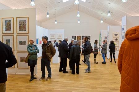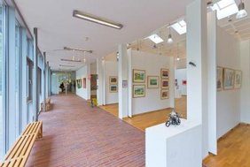 Weiter hinten wird man gebannt vom lebhaften Blick in den maskenhaft 'geschnitzten' Porträtzeichnungen von Georg Brinkschulte. Auch in den beiden Kojen finden sich Arbeiten von Künstlern, die seit langem regelmäßig im Kunsthaus arbeiten: Zur Rechten laden die Aneignungen berühmter Gemälde der Moderne von Muhammer Savran zur eingehenden Betrachtung ein. Zu sehen sind naturkundliche Tieraquarelle von Wolfgang Brandl, souveräne Tierporträts, gezeichnet von Wilke Klees, die träumerisch schwebenden Aquarelle von Gerd Schippel und die menschenfreundlichen Szenerien von Anton Fliss. Die gegenüberliegende Koje ist unterschiedlichen Verfahren der Abstraktion gewidmet: Hier hängen abstrakt verdichtete, intensiv leuchtende HausBilder von Paul Berger, gestische Abstraktionen von Matthias Stöppeler, die entfernt an Mangrovenwälder oder auch andichtes Gefieder erinnern; konkrete Farbstudien von Alfred Olschewski und zwei Blattfolgen der Gedanken-Reisen von Hans-Georg Kastilan; auf einem Sockel eine der lebendigen, 'ungestalt' eleganten Turm-Keramiken von Helmut Liczniersky. An der rückwärtigen Wand des Ausstellungssaals werden Papiercollagen von Bernhard Pfitzner gezeigt, ästhetische Neuformatierungen, die er aus weggeworfenen Papieren und Briefumschlägen mit farbigen Tapes ‚recycelt‘.