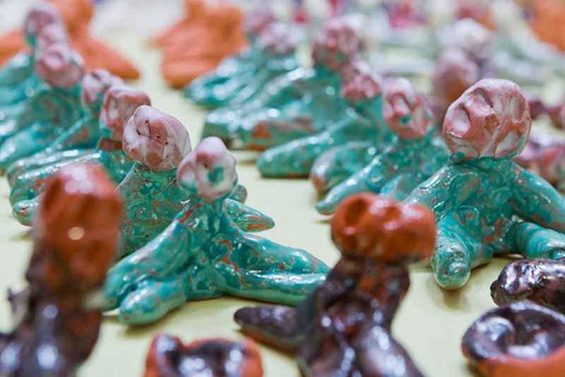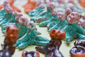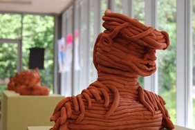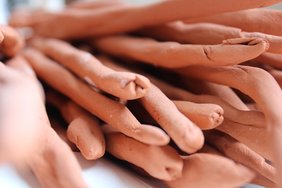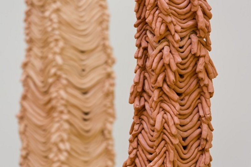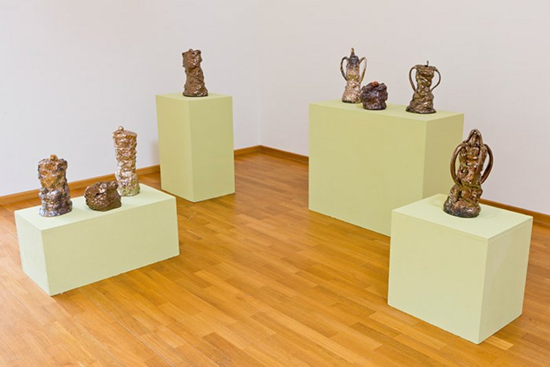 Die Köpfe von Nicole Szlachetka zeigen buchstäblich, empfindsam und humorvoll, was in unserem Kopf vorgeht. Wie kostbarer Bruch oder lebendige Fragmente sehen die kleinen Werkstückevon Katharina Bendel aus und vermitteln so sehr sinnlich den Eindruck des Irdischen. Paul Berger formt stereotype Figuren in Serie, die sich zu einem offenen Relief weitläufig in die Ebene verteilen. Helmut Licznierski gliedert und schichtet Ton zu geheimnisvollen labilen Turmbauten. Farbig gefasst erscheinen sie in ihrer ungelenken Eleganz gleichwohl ganz abstrakt. Hubertus Roerkohl türmt das Material zu einem Gefäß und platziert obenauf eine Kugel. So entsteht ein triumphales Objekt: sein schillernder "Pokal" im Gestus einer Trophäe.