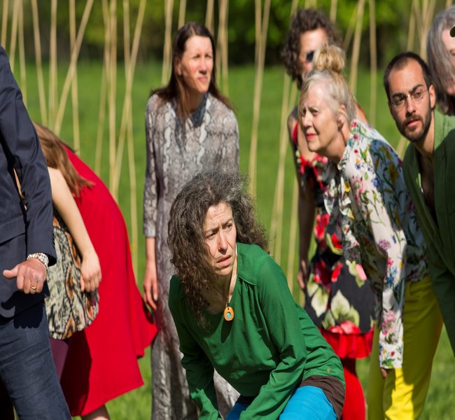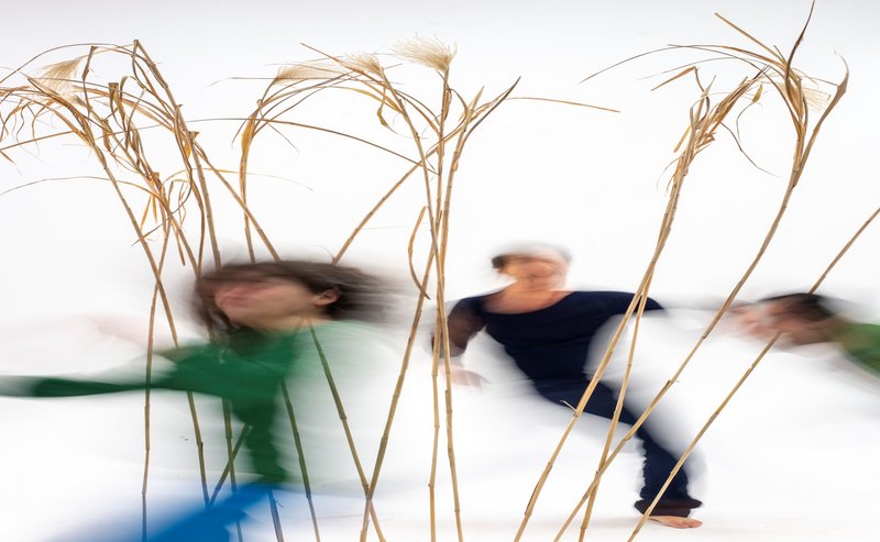 Das Theater Saurüssel aus Münster geht vom Gerüst auf die Wiese, von der Vertikalen auf die Horizontale. Auf dem Alexianer Campus, im Sinnespark, wurden auf der Wiese zarte Linien mit Schilfstäben gesteckt. Zwischen den Linien von Schilfstäben tauchte Wildes und Friedliches, Fremdes und Schönes, Sanftes und Rauschhaftes auf, tanzte, schwärmte und verschwand.