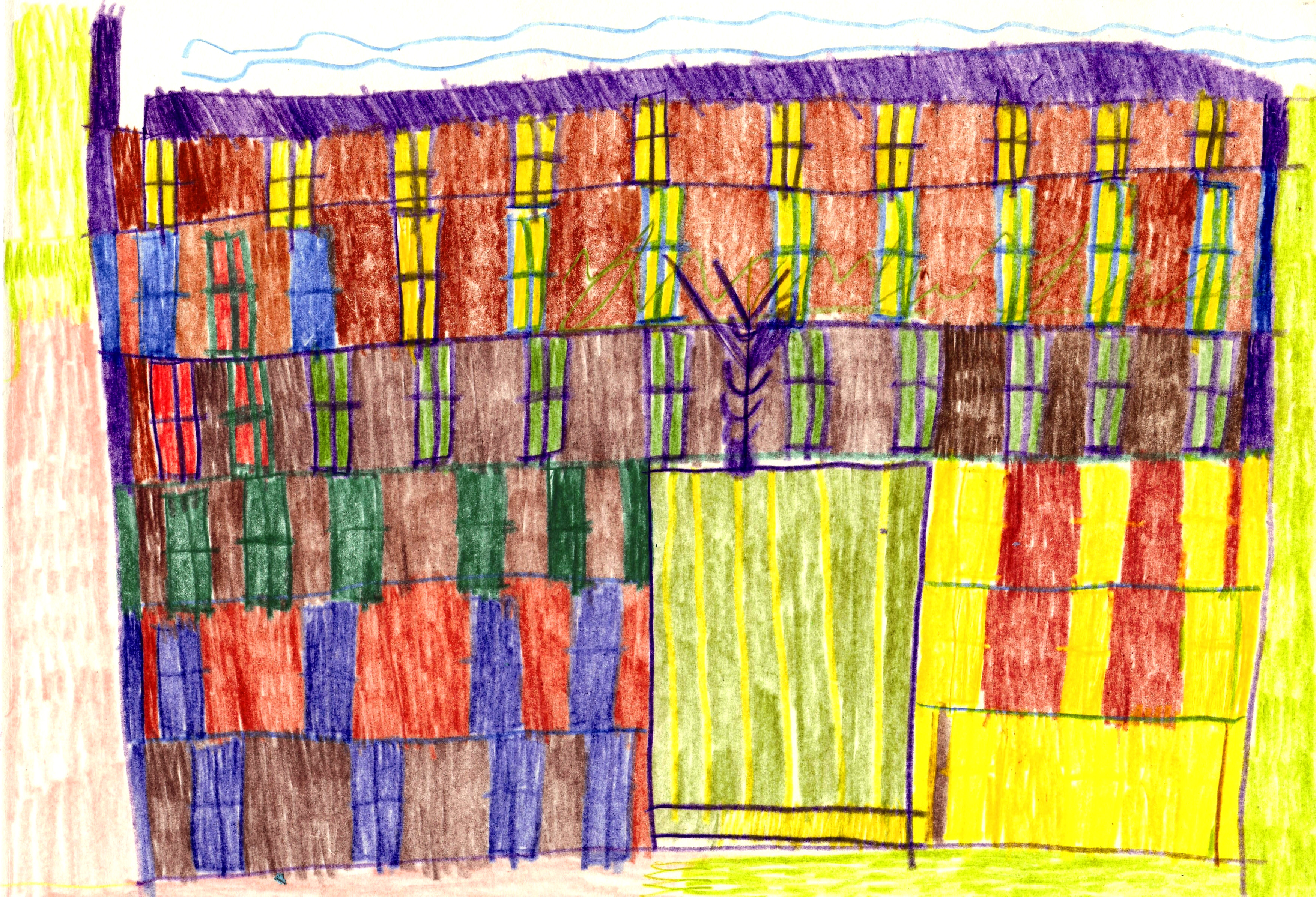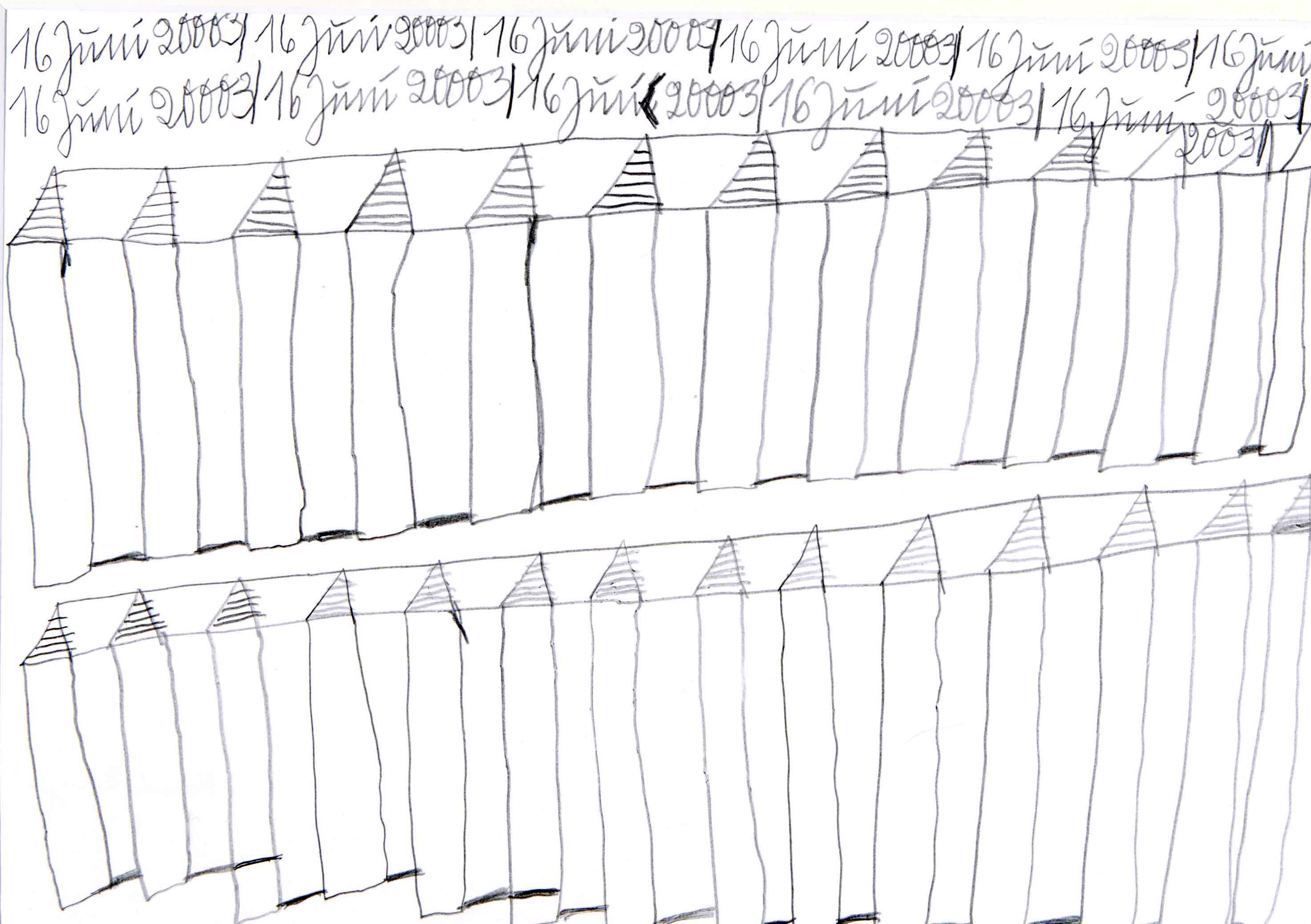 Heinrich Büning, wurde 1925 in Coesfeld geboren und wuchs dort auf einem Bauernhof auf, seine Jugend wurde stark landwirtschaftlich geprägt. Mit einer seelischen Erkrankung lebte er 36 Jahre in Haus Kannen und verstarb 2010. Er betätigt sich bereits seit den 90ern Jahren mehrmals wöchentlich in den Ateliers. Einerseits zeichnet er dabei in großer Häufigkeit Häuserreihen, wobei er verglichen mit den anderen beiden ausgestellten Künstlern relativ wenig Farbe nutzt und allgemein eher schlicht agiert. Auf der anderen Seite kombiniert er dies teilweise auch mit dem zweiten großen Schwerpunkt seiner Arbeit, bei dem er mit Bleistift in Sütterlin-Schrift immer wieder bestimmte Zahlen und Daten, wie etwa das aktuelle Tagesdatum, wiederholend aneinanderreiht. Demnach arbeitet er sogar innerhalb eines einzigen Bildes mit dem Prinzip der Wiederholung.