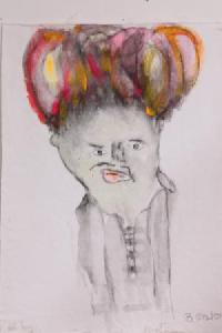 Baby Appachan (ca. 60 Jahre alt) zeigt sein gegenüber immer ansichtig und in einer aufrechten Haltung, stereotyp gibt er Augen, Nase und Brauen wieder, die er unterschiedlich platziert,so dass verschiedene Proportionen und Gesichtsausdrücke entstehen. Genau beobachtet skizziert er mit weichen Lippen einen sinnlichen Mund. Es sind runde Gesichter mit flächigen, ebenmäßigen Zügen; zart, kindlich, freundlich. Die Zeichnung auf ungebleichter Baumwolle wirkt lebendig und die transparenten Farben scheinen das intensive Licht Indiens einzufangen.