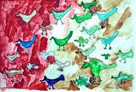 Einen ganz anderen Gestus hat Bruno Ophaus, der die Farben locker über und nebeneinander legt und Figuren und Motive weich umreißt. So weist das Gezeigte über sich hinaus, wie der Quittenbaum, der wie ein Weltenbauman seinen Armen die Fülle seiner Früchte zeigt. Bei der Entwicklung des Lebens spielt die (Körper-)Haltung eine entscheidende Rolle. In humorig bewegten Serien zeichnet Ophaus nach, wie sich mit der Form der Wirbelsäule auch das charakteristische Erscheinungsbild der Lebewesen ändert: von den Amphibien, über die Vögel bis hin zu den Säugetieren eine Familienähnlichkeit aber bleibt. Was sich über die Zeit ausprägt, wird manchmal in einem einzigen Moment besonders sichtbar.