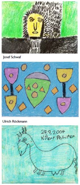 Fabelhafte Tierwesen, geometrische Formen und in kräftige Farbkompositionen eingebettete personenartige Figuren finden in den ausgestellten Zeichnungen zusammen. Ulrich Röckmanns Arbeiten bestechen vor allem durch die Klarheit ihrer Kompositionen, in denen er seine psychotische Gedankenwelt in einer geometrischen Formensprache abstrahiert. Einfache Figuren gehen durch Farbgebung und Anordnung miteinander eine Beziehung ein, die ihrer ganz eigenen Struktur folgt. Bei genauerer Betrachtung eröffnen die klein am unteren Bildrand eingefügten Titel wie beispielweise „Schlippsparade" oder „Sputnik am Horizont" überraschend neue Perspektiven auf die Zeichnungen. Die Arbeiten von Josef Schwaf unterscheiden sich davon in ihrer Unruhe. In energischer Zeichentechnik bringt er meist personenartige Figuren aufs Papier. Sie stehen in einem spannungsreichen Verhältnis zu ihrer Umwelt und scheinen von den Wirren um Sie herum einerseits erdrückt zu werden und sich gleichzeitig gegen sie zu behaupten. Als Inspirationsquelle dienten Schwaf oft Vorlagen verschiedener Künstler wie Matisse, Rousseon oder auch Munch, die sich aber nur teilweise entdecken lassen. Allen drei Künstlern gemeinsam ist die kräftige bis grelle Farbpalette, wobei August Vibert diese am sparsamsten einsetzt. Seine kleinformatigen Skizzen weisen meist nur zwei bis drei Farben auf, mit denen er tierartige Wesen schafft, die scheinbar anderen Welten entsprungen sind. Dabei ähneln sie sich alle in ihrer unverkennbaren vibertschen Darstellung und lassen doch jeweils immer wieder neue Kuriositäten entdecken. Ihre besondere Ausdruckskraft gewinnen sie durch das Zusammenspiel der flächigen, kontrastreichen Farben und den spielerischen Formen.