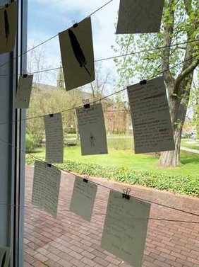 Mitmachen: Fadenlyrik ! Nehmen Sie am poetischen Schreib-tisch platz und lassen Sie die Ausstellung weiter wachsen. Am Eingang des Ausstellungssaales sind feine Seile mit Zettelchen aufgespannt, die darauf warten von Ihnen beschrieben zu werden.