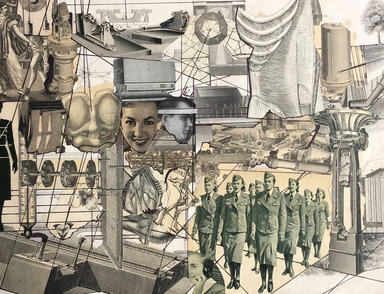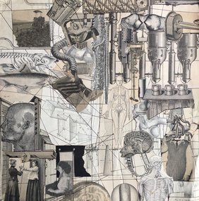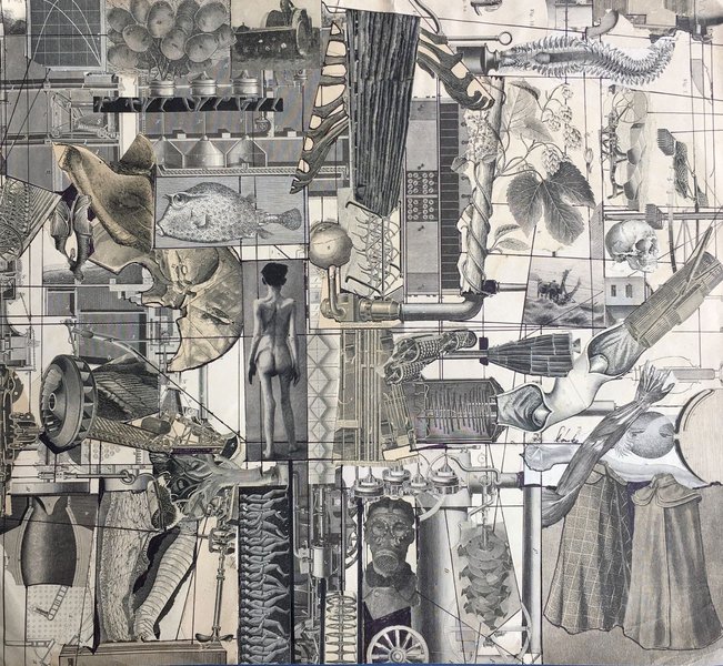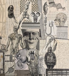 In den Papiercollagen, verwendet G.Brendler Bild- und Textmaterial aus alten Medizin-, Mode- oder Technikbüchern. Die gerissenen oder geschnittenen Fragmente montierte er häufig auf Schnittmusterbögen aus Modezeitschriften oder auf den Einbanddeckeln von Büchern. Die uns vorliegenden dichten Collagen entstanden im Zeitraum zwischen 1973 und 1992.