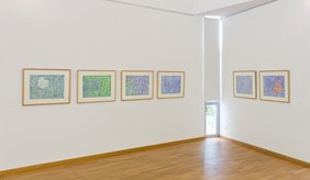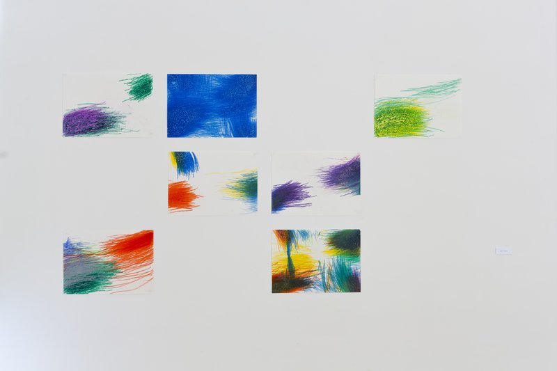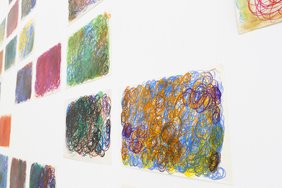 In einer überraschenden, äußerst gelungenen Hängung präsentieren sich die Blätter von Paul Stephan: wie Farbwerte einer wandfüllenden digitalen Rastergrafik. Dass sie anders als die Texturpixel einer Computergrafik jedoch keine reinen Flächenelemente sind, erkannte man, wenn man näher herantrat. Was von weitem eine binäre Ordnung repräsentiert, erwies sich aus der Nähe als individuell und komplex. Hier entdeckte man die irreguläre Spur unzähliger Kreislinien, die sich zu Farbknäueln verdichteten und an den Rändern wie lose Enden in die offene Fläche ragten. Aus dem meist dunklen dominanten Farbspektrum blitzten andersfarbige kurze Linien und Kreise hervor, die Farben interagierten, und im sehenden Nachvollzug ergaben sich immer feiner abgestufte Varianzen. Die Farben lichteten sich oder scheinten durchleuchtet, es ging um Trübungen und Zwischentöne, um Verschmutzung und Klärung, um Bewegung und Stillstand.
