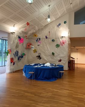 Ein reich gedeckter Tisch, beladen mit allem was das Herz begehrt, grüßt die Besucher*innen zur Rechten des Einganges der Ausstellung. Apfelmus, der am besten zu Fischstäbchen gereicht wird, bietet mit den Gummibärchen ein Festmahl für die Augen. Das ungewöhnliche Menü ist in Gesellschaft der Bären einzunehmen, am besten gemeinsam, unter einer Discokugel. Schauen Sie einmal auf die Speisekarte, es ist für jede*n etwas dabei. Mit der Installation lässt die Studentin Birthe Langner die Besucher*innen in die Geschichten von Susanne Blümer eintauchen, deren Lieder man ebenfalls am Tisch lauschen kann.