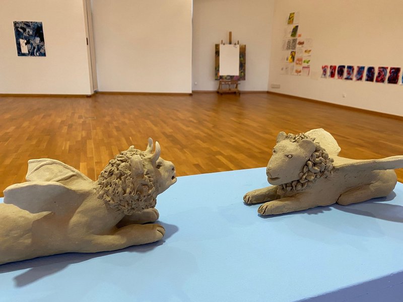 Im Zentrum des Raumes stehen sich Chimäre und Mantikor gegenüber. Diese sich aus verschiedenen Tierarten zusammensetzenden Wesen entstanden aus der Zusammenarbeit von der Kunststudentin Charlotte Nebeling mit Stefan Reimer. Die Bilder von Martina Parisi und Gaby Kremling, die sich gleich nebenan befinden, zeugen nicht nur von einer künstlerischen Zusammenarbeit, als auch von einer energetischen.