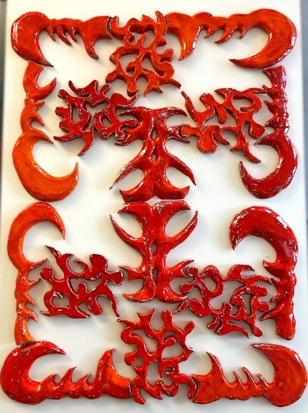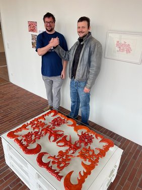 In der Keramikarbeit von Stefan Reimer und Finn Köhntop wachsen zwei Muster zusammen. Die Muster, die Stefan Riemers Kunst dominieren, wurden bereits in einigen Ausstellungen im Kunsthaus Kannen präsentiert. Auch Finn Köhntop beschäftigt sich in seiner Kunst mit Mustern und so erwuchs schnell die Idee ein Werk zu schaffen, das die unterschiedlichen, für Künstler und Student charakteristischen Muster, ineinander vereint. Die beiden entschieden sich dazu, ihre Arbeit in Ton umzusetzen und während Stefan Reimer begann seine Muster frei Hand in Ton umzusetzen, erstellte Finn Köhntop eine Skizze der Arbeit. Mit diesem festgelegten Rahmen entstand ein Werk, in dem die beiden Muster fast organisch ineinander wachsen. Obwohl die Handschrift der beteiligten Künstler noch zu erkennen ist, fügen sie sich zu einem harmonischen ganzen zusammen.