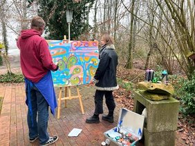 Mit Sprayfarbe und Keramik, gebrannten Glasuren und farbigen Holzflächen präsentiert die Werkschau die Früchte einer tiefgreifenden Zusammenarbeit. Zwei Studierende der Kunstakademie Münster und zwei Künstler des Kunsthaus haben gemeinsam Werke geschaffen und sich über künstlerische Praktiken ausgetauscht. Dabei geht es um die Frage, ob man eine Wellenlänge zwischen der Kunst von zwei unterschiedlichen Menschen finden kann. Die Ausstellung lädt ein, dieser Frage nachzugehen.