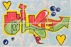 Wilke Klees und Justeen Chapman arbeiten gemeinsam mit den unterschiedlichsten Materialien. Einerseits bemalen und glasieren sie Fliesen, andererseits sprayen sie zusammen auf großen Holzplatten mit Sprühfarbe. Was sie verbindet ist eine Liebe für Graffiti. Was sind die verschiedenen Wege, wie man Buchstaben bauchig und plump oder zackig und energetisch aussehen lassen kann? Wie kann man mit Hilfe von Sprühfarbe Dinge hervorheben und Tiefe schaffen? Über solche Fragen haben sich der Künstler und die Studentin während der gemeinsamen Arbeit ausgetauscht und so Werke geschaffen, die von einer tiefgreifenden Zusammenarbeit geprägt sind.