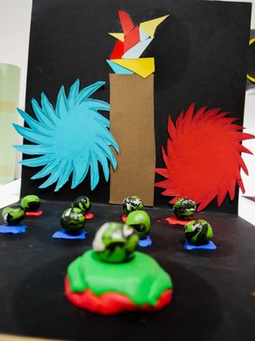 Das gemeinsame Buch ist voll von Figuren, Bühnenbilder, die von einzelnen Mädchen und Jungen geschaffen wurden. Zum Beispiel wurden Linien und Sätze von einer Person begonnen und von einer anderen auf unerwartete Weise weitergeführt. Die so entstehende Geschichte wurde unter der Interaktion der Schüler*innen erschaffen. Sie ist nicht die Geschichte einer einzelnen Person, sondern die Geschichte von uns allen.