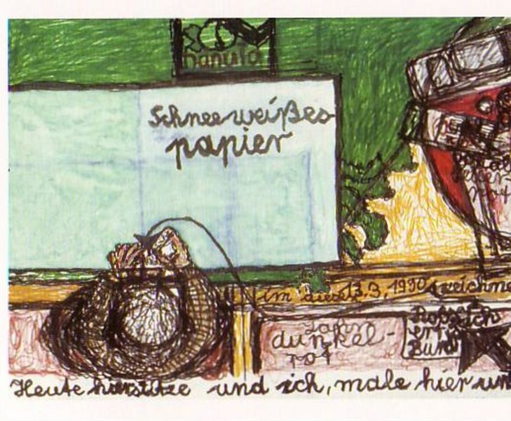 With meticulous fascination for details, Robert Burda records his life story. Born in 1942, he spent his childhood and youth in Bremen-Blumenthal/Germany, where he was particularly interested in streetcars, buses and ships. Robert Burda draws his motifs with technical precision, and provides them with descriptions that allow an insight into his inner world. Even at a young age, he had repeated stays in mental institutions, where he documented his surroundings and his work in drawings. He drew the dormitories and dining rooms from a bird's-eye view in order to locate not only himself but also other people. Since 1968, Robert Burda has been living in the residential area of the Alexians in Münster, and has also captured his world on paper here. If you look at his pictures from a historical perspective, you can see in them documented the gradual reform of psychiatry. The inhumane conditions in mental institutions after the end of the war and the slow improvements are often told from the perspective of the reformers.