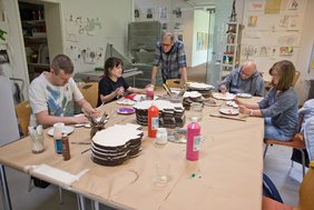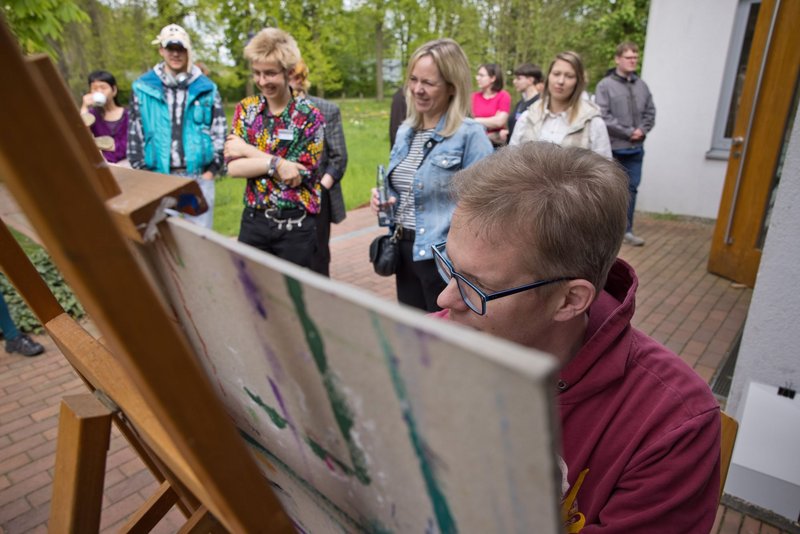 Ralf Emmerich's large black and white photographs of the residents can be seen in the foyer of the Kunsthaus and in the hallway of the historic old building on campus. Since 1992, he has regularly captured the residents and the studio situations with his camera for years. Further pictures by the photographer can be seen in the exhibition PHOTOGRAPHS 1977 - 2023 in the Stadtmuseum Münster (Münster City Museum).