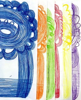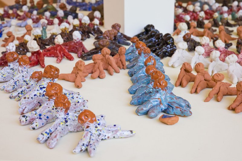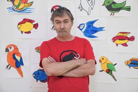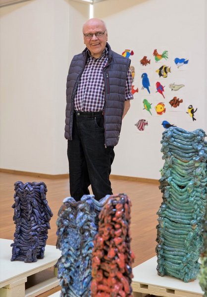 Since Paul Berger started working with art, the motif of the house is always part of his artwork. With the dynamic use of wax crayons, he creates different colourful houses. All of them have different sizes, details and colours. Moreover, the view of the huge amount of clay figures, that he created, is spectacular too.