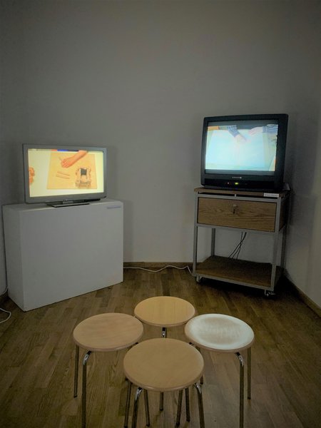 In the exhibition's film room you can take a closer look at the working methods of the artists. On the four screens you can watch the artists at work and thus at repetition. For this purpose, every artist had himself filmed from a bird's eye view while creating. The work processes, each of which can be seen on a screen, are played out in ceaseless repetition.