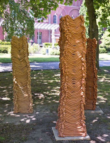 Helmut Licznierski uses clay to build high towers. Each tower is different and unique because of his height, width, its bending, and curvature. The various clay layers create flowing or sometimes straight transitions. Even if it is the same working process to put clay strands on clay strands, every tower is special.